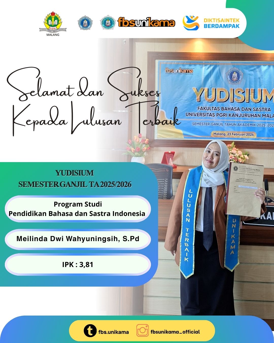 Pada kesempatan tersebut, diumumkan pula lulusan terbaik Program Studi Pendidikan Bahasa dan Sastra Indonesia, yaitu Meilinda Dwi Wahyuningsih dengan Indeks Prestasi Kumulatif (IPK) 3,81. Prestasi tersebut menjadi bukti dedikasi, kerja keras, dan komitmen dalam menempuh proses akademik secara konsisten.
