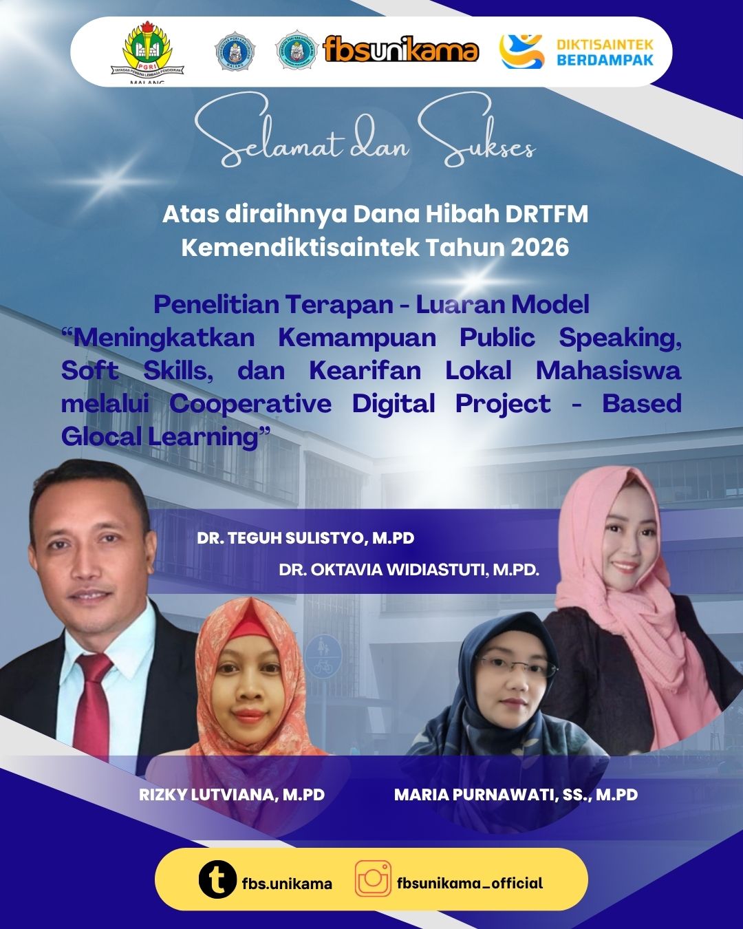 Universitas PGRI Kanjuruhan Malang (UNIKAMA) kembali menorehkan prestasi membanggakan di kancah nasional. Tim dosen dari Program Studi Pendidikan Bahasa Inggris berhasil meraih pendanaan hibah dari DRTPM Kemendiktisaintek Tahun 2026 dalam skema penelitian terapan dengan luaran model inovatif.